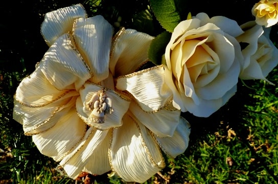 Behold! My first-ever homemade bow! See the tiny angel? She represents Maymer and Nana, spiritual giants of short stature. In the curve adjacent to the gilt-edged bow, I placed creamy white roses, as fair as our grandmothers’ porcelain complexions.