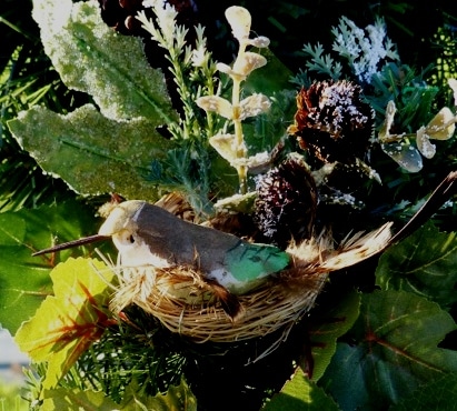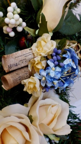 Get this: I’d never made a wreath for a loved one before, much less a total stranger! So what? My inner voice asked. I answered the challenge by grabbing my car keys and heading to Michaels. Not for me, something purely decorative…I’d pull together thematic elements! The circular shape would speak of unity—the joining of hands across the miles, a warm embrace in absentia. And the sturdy evergreens would represent our grandmothers’ character: strong women who endured hard times without complaint, who embroidered the fanciful into the everyday, and who sowed seeds of grace in every word and deed.