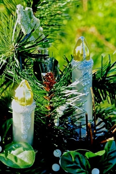 I then clipped two candles on the upper right corner, humming as I placed them among the greenery: These little lights of ours, I’m gonna let ‘em shine… Sprigs of mistletoe are scattered at the base of the candles, for who deserves bunches of kisses more than a beloved grandmother?