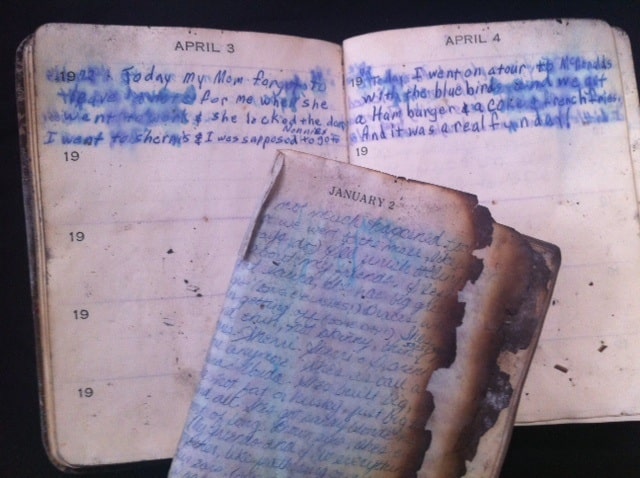 When our house burned down in 1994, all three levels burned to the ground. There was not a trace left of the sofa, the dining table, the piano. And yet, my husband, wearing thigh-high fishing boots, dug through piles of rubble four-feet deep and pulled out small blackened squares. They looked like charcoal briquets, but they turned out to be my childhood diaries. One of them used to have a Holly Hobbie cover and a little gold key attached.