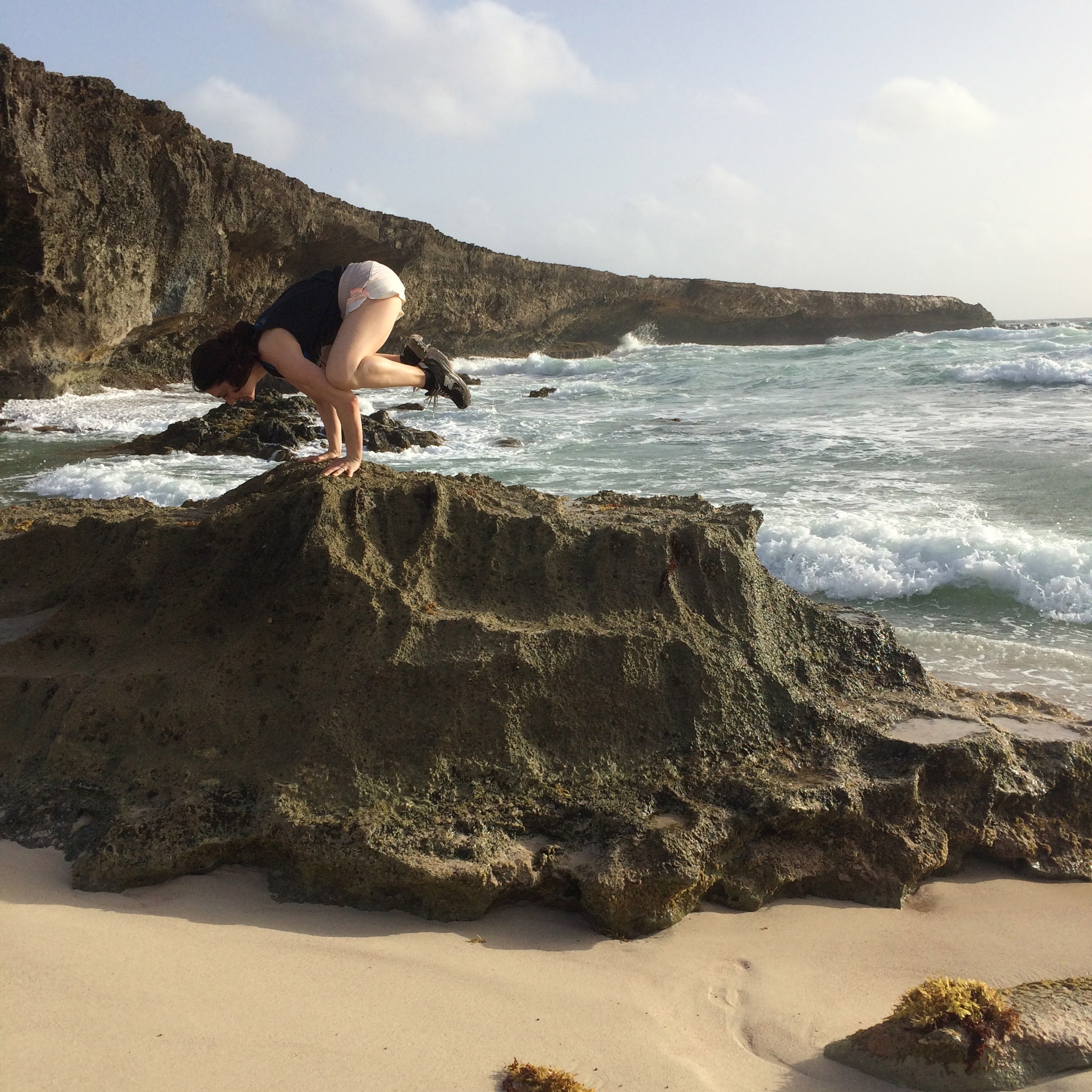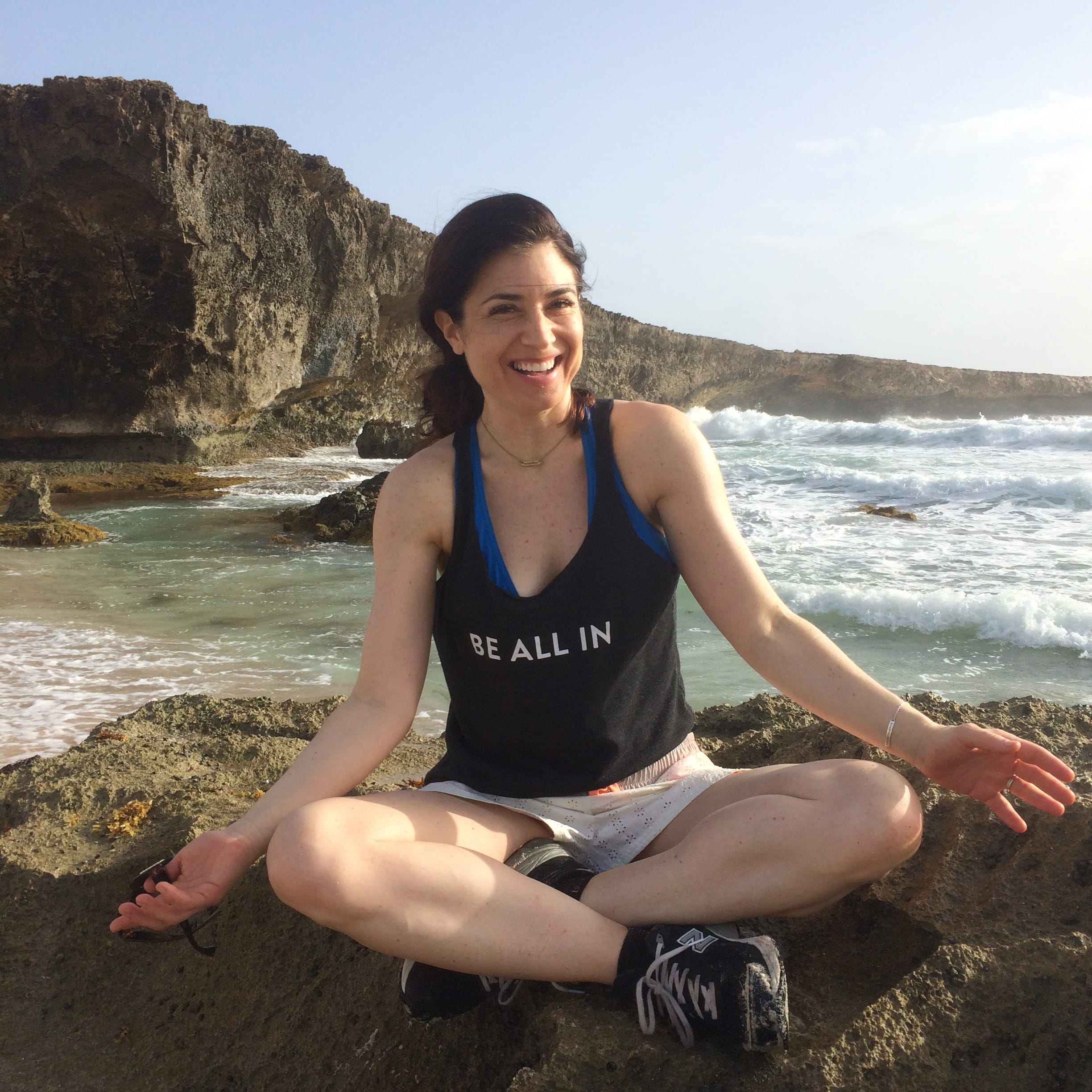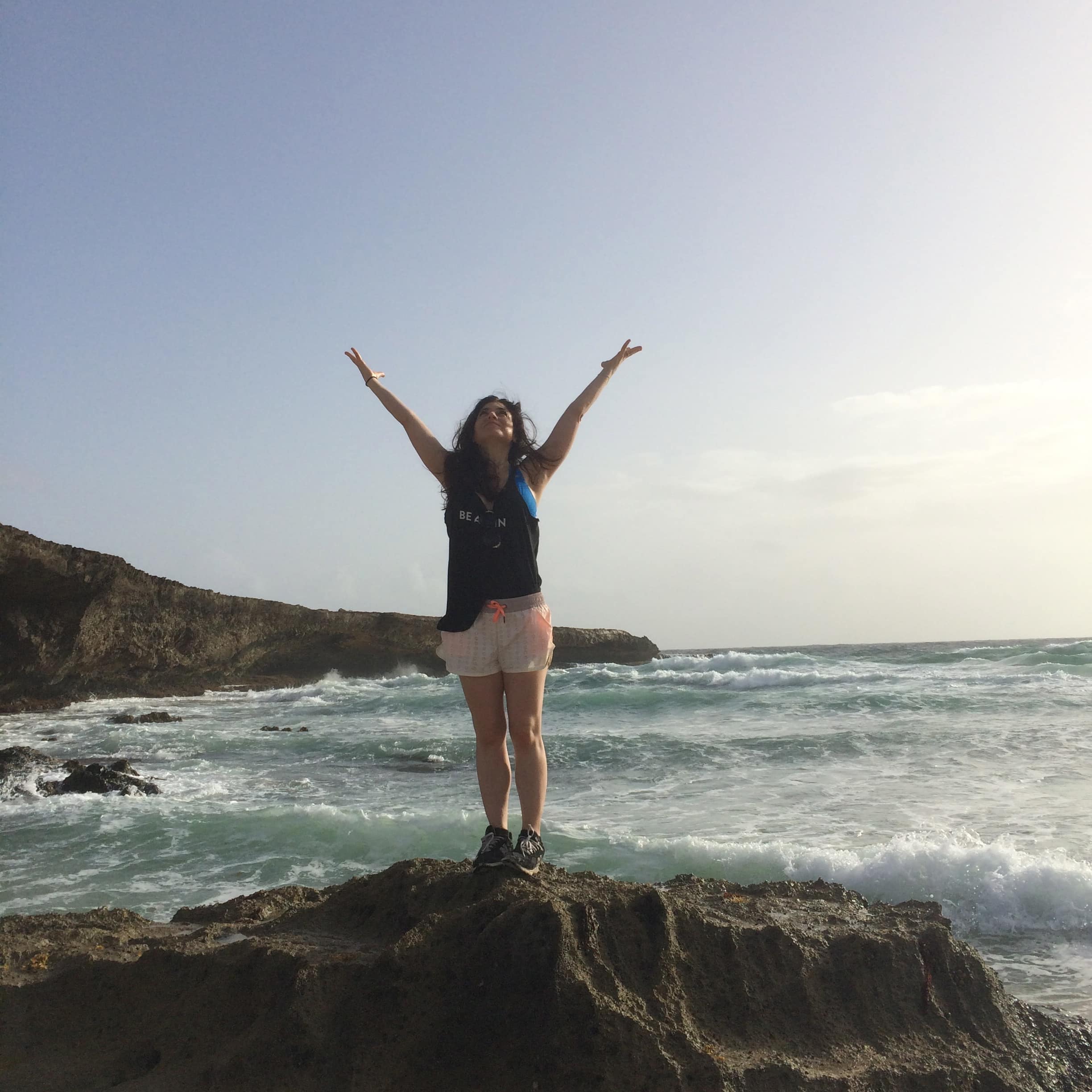 We continued to walk until we reached the coastline. I climbed up on the rocks and tried to do a yoga pose but it was slippery and I was scared so I stood there with my arms in the air as my friend Yulady took a picture. I was wearing a tank top that said Be All In and was I ever. My feet were aching, my skin was filthy, I was soaked from a wave that had crashed on the rocks, but my god, was I all in, knee-deep in, waist-high in, up to my neck in, I was in, and I would keep going in, deeper.