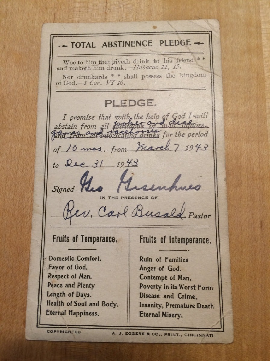 Just last week, my cousin unearthed a document signed by our Grandfather in 1943. It’s an Abstinence Pledge, but the language about refraining from “intoxicating drink” has been marked out. Instead, Grandpa signed the document, promising, with the help of God, to abstain from all “poker and dice games and racehorses” for the period of ten months.